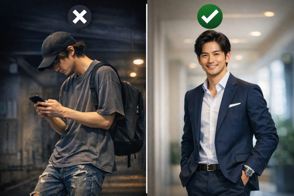 | 姿勢が悪く落ち着きがない | 背筋が伸びた余裕ある立ち姿 |