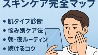 スキンケア 【保存版】男性の肌悩み別スキンケア完全マップ|40代からの正しい方法 40代男性の肌悩み(乾燥・テカリ・毛穴・くすみ)をタイプ別に解説。脂性肌/乾燥肌/混合肌の診断から、朝夜10分でできるスキンケアルーティン、続けるコツまで完全ガイド。 2025.10.19 スキンケア