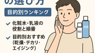 スキンケア メンズ化粧水・乳液の選び方|目的別ランキング 男性のスキンケア初心者必見。化粧水・乳液の役割と順番を解説し、乾燥・テカリ・エイジングケア別におすすめランキングを紹介。朝夜ルーティンの使い方も図解でわかる。 2025.10.19 スキンケア